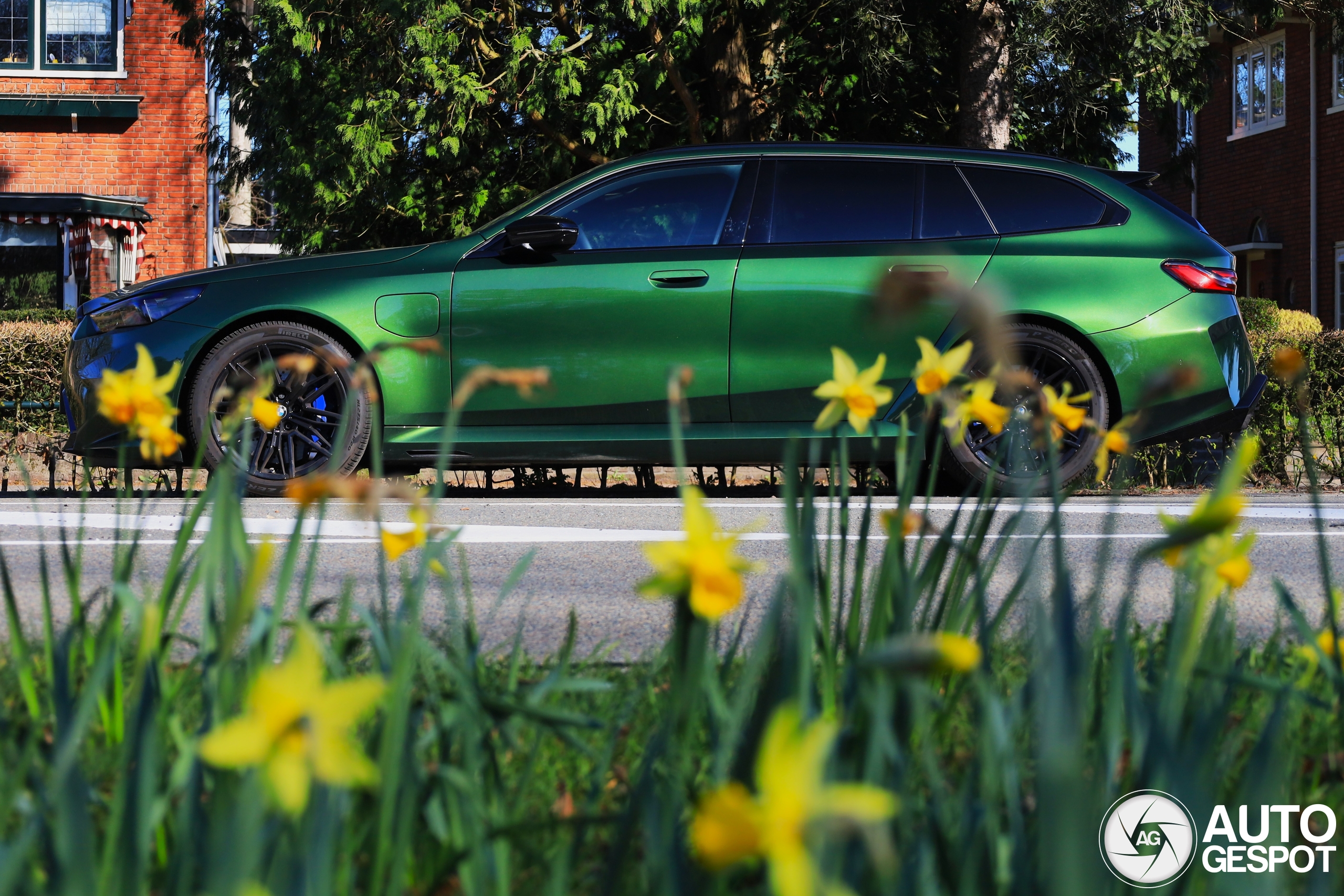 Ik struikel bijna over de M5 Touring, maar 95% ervan is zwart, en dat is nu precies de allerslechtste kleur voor deze auto. Gelukkig heeft deze eigenaar gekozen voor een mooie metallic groene kleur, die fraai oplicht in de zon en mooi contrasteert met de gele narcissen.