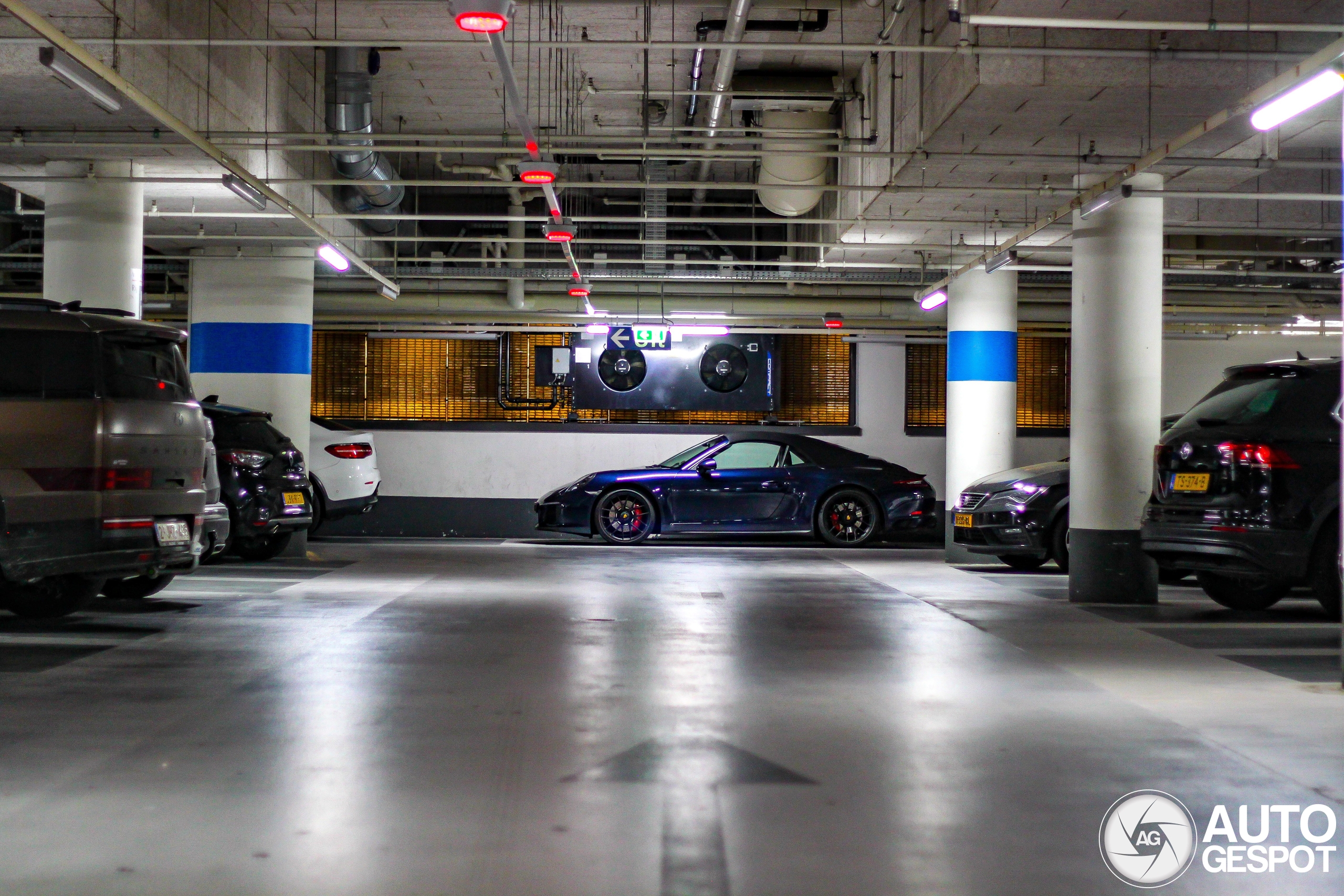 Heerlijk exemplaar in het donkerblauw met zwarte Centerlock velgen, rode remklauwen en zwarte softtop. Stond er mooi bij aan de rand van de bovenste verdieping van deze parkeergarage.